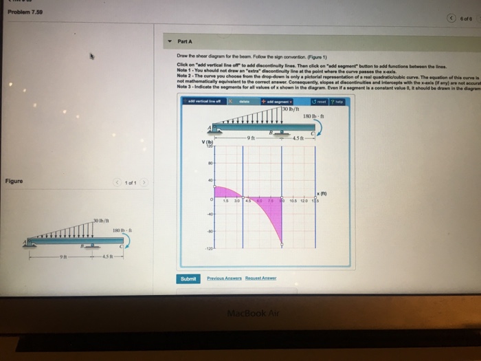 Note 1 - You should not draw an "extra" discontinuity line at the point where the curve passes the x-axis. Note 2 - The curve you; Question: Problem 7.59 Part A Draw the shear diagram for the beam. Follow the sign convention. (Figure 1) Click on 'add vertical line off to add discontinuity lines.