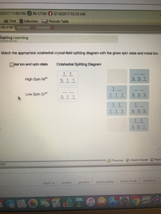 Match the appropriate octahedral crystal-field splitting diagram with the given spin state and metal. VRE BRU SPRE SPALLARS URSA Answer Bank high-spin Ni3+ ... Match the appropriate octahedral crystal-field splitting diagram with the given spin state and metal ion. Metal ion and spin state Octahedral Splitting Diagram High Spin Ni3+ Low Spin Fe 4+ Question: Match the appropriate octahedral crystal-field splitting diagram with the given spin state and metal ion. Metal ion and spin state Octahedral ... Chemistry questions and answers. Match the appropriate octahedral crystal-field splitting diagram with the given spin state and metal ion. Metal ion and spin state Octahedral Splitting Diagram High Spin Ni3+ 1レ 1レ 1レ Low Spin Mn3+ 1レ1レ11レ11.