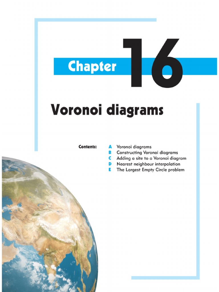 2 Voronoi cells # Now we can construct the Voronoi cells around each of the seed points. It's not obvious that Delaunator, a library for Delaunay triangulation, can construct Voronoi cells. For that, I refer you to the Delaunator Guide [5], which shows sample code for constructing Voronoi cells (without clipping). The above description of an algorithm VORONOI_DIAGRAM leads to the following conclusion. In the worst case, O(n log n) time and linear space is requires to construct the Voronoi diagram of n sites in the plane using the divide-and-conquer paradigm. Note that both bounds are optimal. There are many variation to this classical divide-and-conquer ... Voronoi diagrams can be constructed by hand or using computer imaging software. To accurately construct a Voronoi diagram, a map called a Delaunay Triangulation must first be created. These triangulations can be constructed using either circumcircles or linear geometry. For the purposes of the investigations within this module, we will be using the later method, however, you may first need to ...