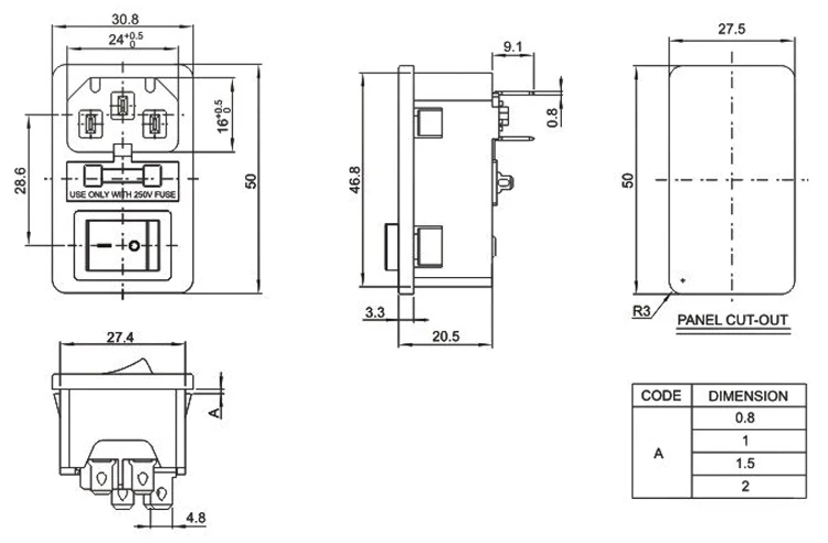 So I just noticed this information on the ebay product page. Description: 3 pin IEC320 C14 plug, 7 terminals, built in a red light bulb DPST rocker switch, is used widely in lab equipment, medical devices, fitness equipment, industrial automation equipment, etc. Use only with a 250V fuse (fuse not included here). Use this IEC 60320 (IEC 320) reference chart to identify a configuration by ... diagram. C13/C14, 250 Volts 10 Amps, 125/250 Volts 15 Amps, 3 Wires, 2 Poles.