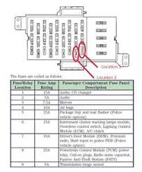 Fuse box diagram (fuse layout), location and assignment of fuses and relays Ford Crown Victoria "Crown Vic" (1998, 1999, 2000, 2001, 2002). 2011 Ford Crown Victoria Police Interceptor Fuse Box Diagram. I have a p71 - this is not the fuse box diagram under my hood- I'm i have a ford crown vic police interceptor and it keeps blowin. Crown Victoria Automobile pdf manual download. The fuse panel is located below and to the left of the steering wheel by the brake pedal. No. A Protected Components 1 15 2003-2004: Audio, CD changer2005-2006: Taxi, Cluster, Lighting Control Module (Interior Lighting) 10 2007-2012: Ignition (START) - Starter relay coil, DTRS 2 5 2003-2004: Audio 10 2005-2006: Ignition (ON) - Electronic Automatic Temperature Control (EATC) module, A/C mode switch (vehicles equipped with EATC only), A/C blower relay coil 7.5 2007-2012: Power ... 2001 Ford Crown Victoria Fuse Diagram, also Mercury Grand Marquis. This 2001 Ford Crown Victoria Fuse Diagram shows two fuse boxes; the Battery Junction Box/Power Distribution Box located under the hood and the Smart Junction Box/Passenger Compartment Fuse Panel located under the dash to the left of the steering wheel, near the brake pedal ...