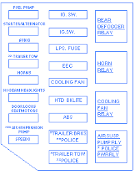 Fuse Box Ford 2003 Crown Victoria Diagram. Fuse Panel Layout Diagram Parts: subwoofer amplifier, trailer exterior lamp relay, horn relay, lighting control module, air suspension compressor relay, air spring solenoid, Starter relay, head lamp, starter relay, generator, radio amplifier, police power relay, daytime running lamp, PCM power relay ... Fuse Box Diagram Ford Crown Victoria Crown Vic - Base, LX and LX Sport (1998, 1999, 2000, 2001, 2002) You can view the 2001 Ford Crown Victoria owners manual online at : www . motorcraft service . com ( no spaces ) click on Owner Guides ( the fuses and relays section starts on page 156 , the Owner ... Ford Bronco (1992-1996)…>> Fuse box diagrams (location and assignment of electrical fuses and relays) Ford Bronco (1992, 1993, 1994, 1995, 1996).