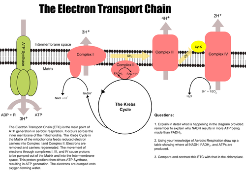 Electron transport chain diagram. Figure 1. The electron transport chain is a series of electron transporters embedded in the inner mitochondrial membrane that shuttles electrons from NADH and ... The electron transport chain is an essential metabolic pathway that produces energy by carrying out a series of redox reactions. This BiologyWise article ... Electron Transport Chain Photosystem I Hydrogen Ion Movement and ATP Formation thylakoid membrane. As the ions pass through, ATP synthase rotates. The rotation creates the energy needed to bind ADP and a phosphate group together to produce ATP. The electrons take on a great deal of energy, which causes them to move to a higher energy level. place in the thylakoid membranes inside of ... 19.06.2019 · The electron transport chain involves a series of redox reactions that relies on protein complexes to transfer electrons from a donor molecule to an acceptor molecule. As a result of these reactions, the proton gradient is produced, enabling mechanical work to be converted into chemical energy, allowing ATP synthesis. The complexes are embedded in the inner mitochondrial membrane …