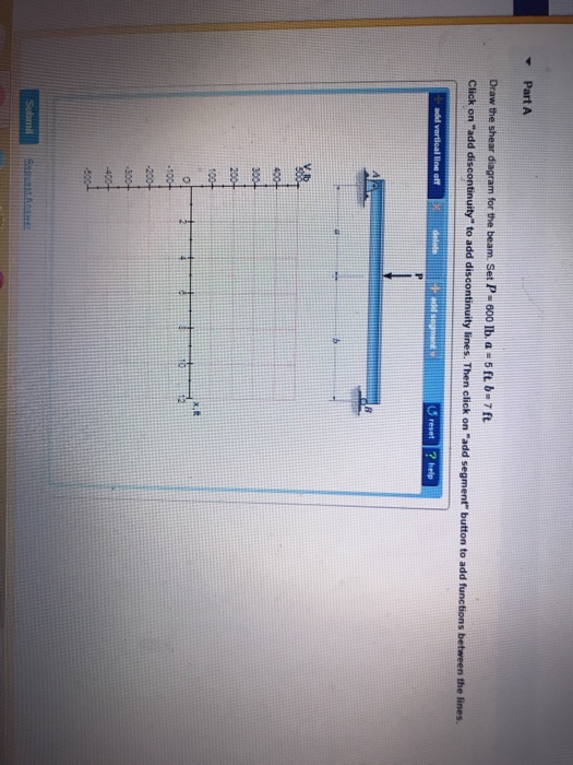 Set P = 600 lb. a = 5 ft. b = 7 ft Click on add discontinuity to add discontinuity lines. Then click on add segment button to add functions between the lines ... Transcribed image text: HW 15 Problem 7.47 Part A Draw the shear diagram for the beam. Set P- 600 lb, a 5 ft, b 7ft Click on "add discontinuity" to add ... Set P = 600 lb, a = 5 ft, and b = 7 ft. This problem has been solved! See the answer ... Draw the shear and moment diagrams for the beam. (a) in terms of the parameters shown; (b) set P = 600 lb, a = 5 ft, B = 7 ft. fullscreen Expand. Transcribed Image Text.