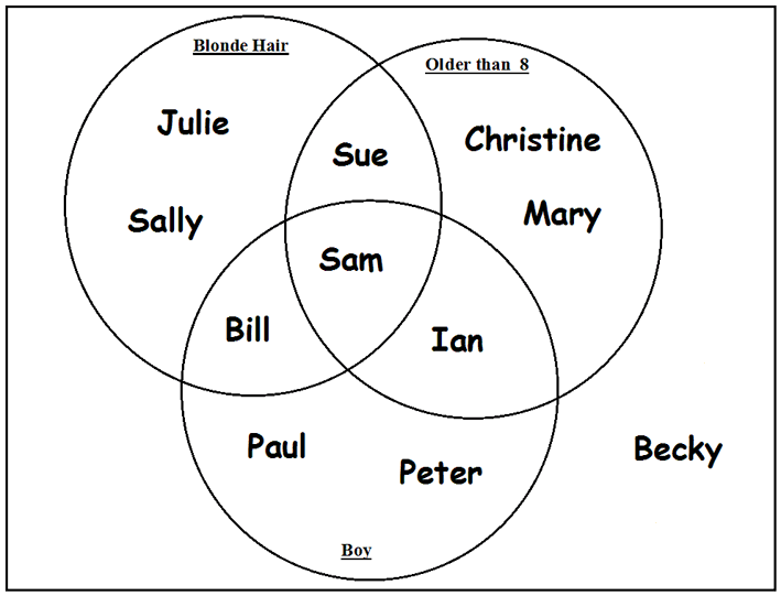 » Venn diagrams. Venn Diagrams are the diagrams which represent the relationship between sets. For example, the set of natural numbers ℕ is a subset of set of whole numbers 𝕎 which is a subset of integers ℤ. We can represent this relationship through Venn diagram in the following way. 7. Venn Diagram can be used for analyzing the effectiveness of websites. 8. Venn Diagrams are used in wellbeing and Psychology. 9. Venn Diagrams are used in mathematics to divide all possible number types into groups. 10. Venn Diagrams help visually represent the similarities and difference between two concepts. Solved Examples - Venn Diagram ... Venn diagrams and the Inclusion Exclusion Principle We can sometimes use the inclusion-exclusion principle either as an algebraic or a geometric tool to solve a problem. We can use a Venn diagram to show the number of elements in each basic region to display how the numbers in each set are distributed among its parts. A venn diagram is the easiest way to express the relationship between sets. Based on the variety of questions that are asked in various competitive exams, we have classified these logical Venn diagrams into following categories, which are given below. Types of Venn Diagram As now we know what consists of the questions related to the Venn ...