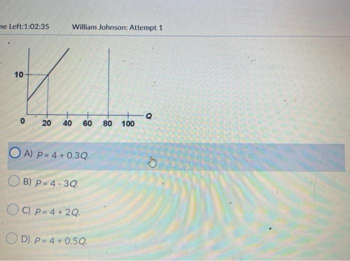 Question: Question 22 (2.5 points) (Advanced analysis) The equation for the supply curve in the below diagram is approximately Р 30 20 10 Q 0 20 40 60 80 100 ne Left:1:02:35 William Johnson: Attempt 1 10 0 20 40 60 80 100 OA) P= 4 +0.30. G OB) P=4 - 3Q.