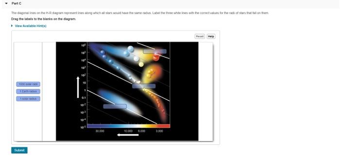 The figure shows a standard Hertzsprung-Russell (H-R) diagram. Label the horizontal and vertical axes using the two blanks nearest the center of each axis, and label the extremes on the two axes using the blanks on the ends of the axes. Y axis staring at the top: Brighter, Luminosity, Fainter. X axis from left to right: hotter, surface temperature, colder. Part B Use the labels to …
