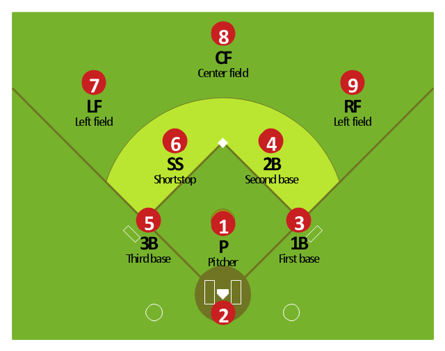 Baseball Diagram — Defence Positions. The vector stencils library "Baseball positions" contains 13 symbols: pitcher, catcher, first baseman, second baseman, third baseman, shortstop, left fielder, center fielder, right fielder, baseball position, pointing arrows. "Baseball is unlike most other competitive sports in that the defense is given control of the ball.