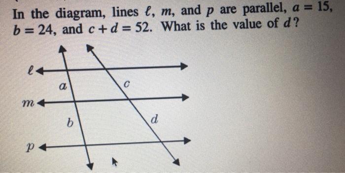 In the diagram, the only figure that could be parallel to line c is ... What must be the value of x so that lines c and d are parallel lines cut by ...