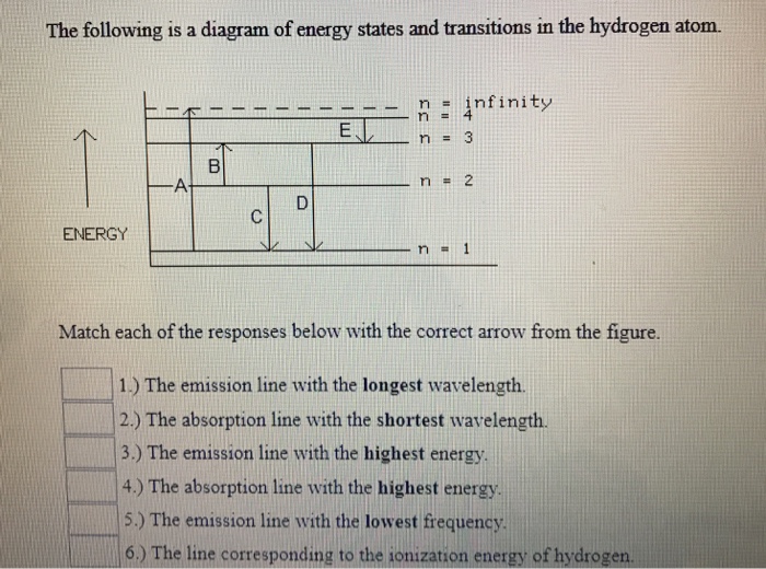 The following is a diagram of energy states and transitions in the hydrogen atom. Match each of the responses below with the correct arrow from the figure. 1.) The emission line with the longest wavelength._____ 2.) The absorption line with the; Question: The following is a diagram of energy states and transitions in the hydrogen atom. Match ...