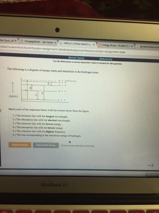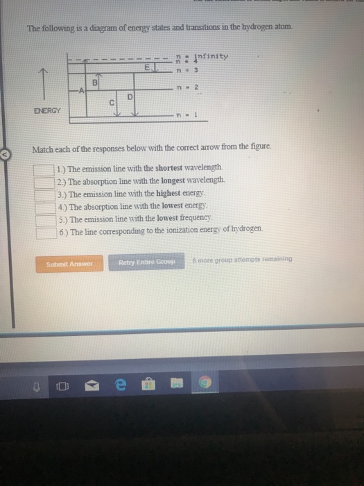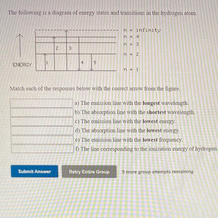 The following is a diagram of energy states and transitions in the hydrogen atom. Match each of the responses below with the correct arrow from the figure. a) The emission line with the shortest ...