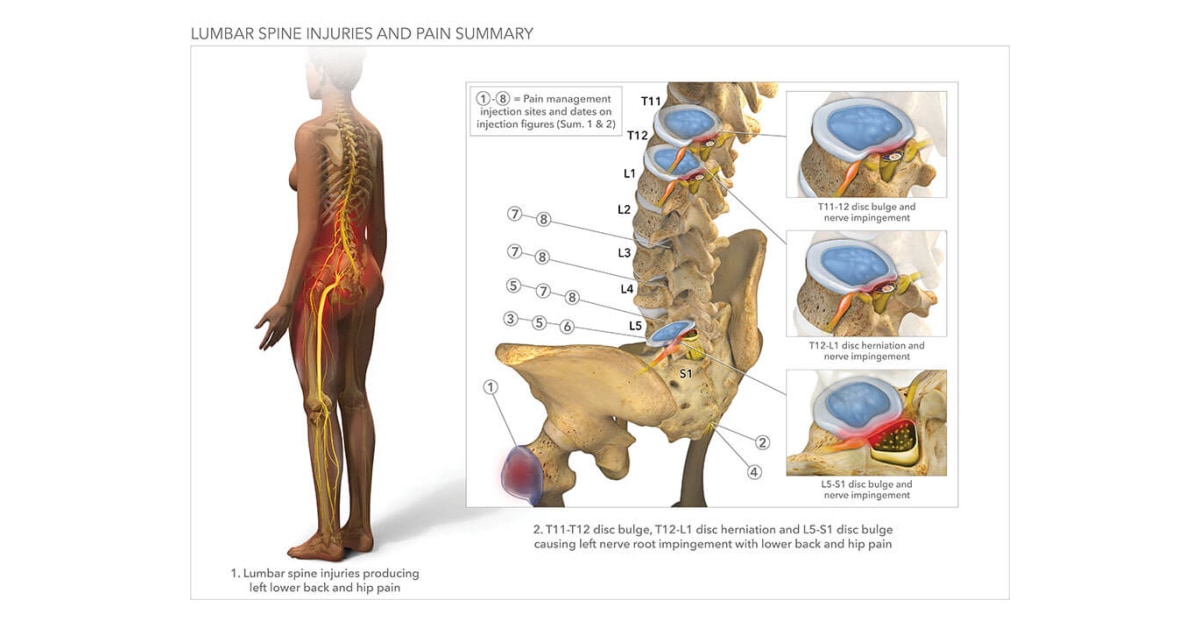 File under medical illustrations showing L5-S1 Disc Space, with emphasis on the terms related to medical disc space spine l5 s1 intervertebral nerve root spinal nerves dura epidural ligamentum flavum. This medical image is intended for use in medical malpractice and personal injury litigation concerning L5-S1 Disc Space. Examination. She presents with isolated back pain over the L4-L5 and L5-S1 facet joints. Flexion is 60% of normal. Extension is limited to 20% of normal because of severe back pain. Straight leg raising tests are bilaterally negative. Strength is normal, but slightly diminished right to L5 light-touch sensation. Lumbar interbody fusion: A degenerated disc is removed and L5-S1 vertebrae are fused together with implants or bone grafts. While performing a fusion surgery, the spinal fixation of the S1 segment usually presents a greater risk of failure (pseudarthrosis) compared to L5. To avoid this complication, the addition of an interbody support (device ... Back pain or leg pain can typically arise due to injury where the lumbar spine and sacral region connect (at L5 - S1) because this section of the spine is subjected to a large amount of stress and twisting. People with rheumatoid arthritis or osteoporosis are inclined to develop stress fractures and fatigue fractures in the sacrum.