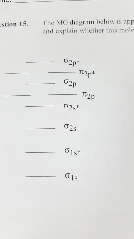 H2^- 4. H2^+ 5. B2^- Q. Use the MO diagram in Figure 7.16a in the textbook to describe the bonding in N2^+, N2 and N2^-. What is the bond order of each? Bond order for N2^+ Q. ... Our tutors rated the difficulty of Use the molecular orbital diagram shown to determine which o... as medium difficulty. The bond order of B2, C2, and N2 are 1, 2, and 3, respectively. B2 has two unpaired electrons with the same spin and therefore is paramagnetic. C2 and N2 are...