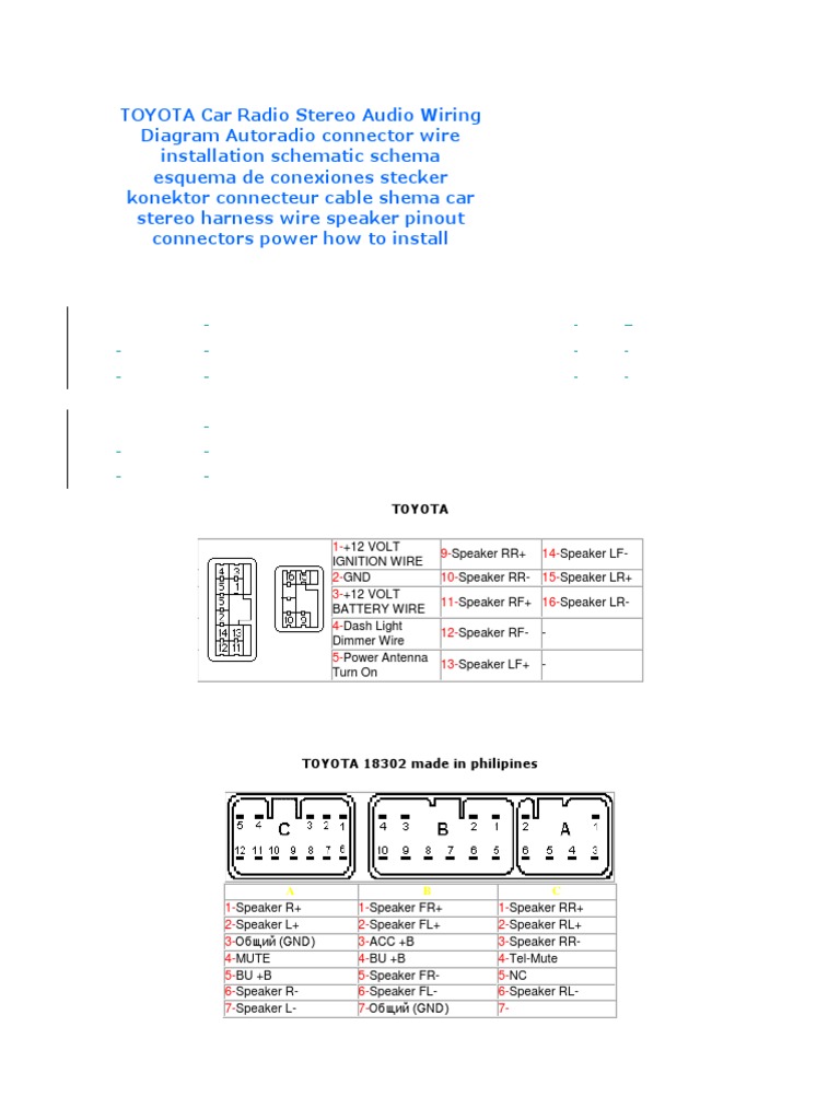 Wiring Diagram Toyota 86120-aa040 Wiring Diagram Toyota 86120-aa040. The other 2 are for power/remote and the speaker wiring harnesses. OF YOU GUY HAVE PIN IN/OUT DIAGRAMS OF TOYOTA FUJITSU TEN. Toyota Camry - Factory AM FM Radio CD Cassette Player AA Toyota Camry AM FM CD Radio Receiver AA OEM LKQ ..