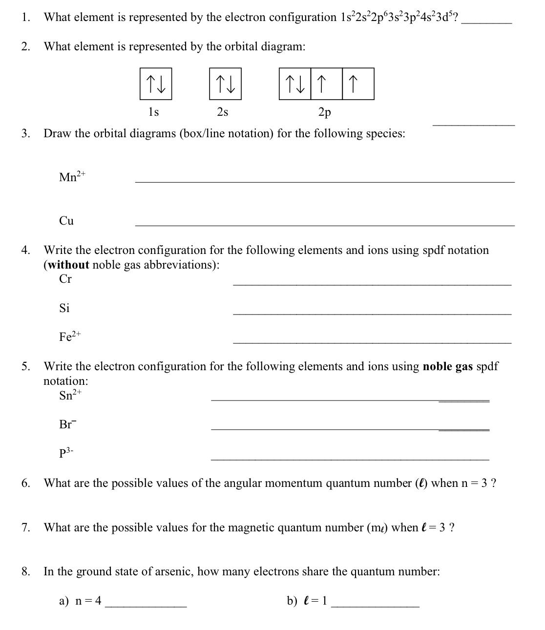 General Chemistry I - Tutorials 2 and 3 | Atomic Orbital | Atoms (c) What does each box in an orbital diagram represent? (d) What quantity is represented by the half arrows in an orbital diagram? 14. Write the condensed electron configurations for the following atoms, using the appropriate noble-gas core abbreviations: (a) Cs, (b) Ni, (c) Se, (d) Cd, (e) U, (f) Pb.