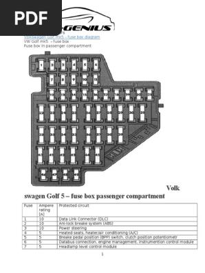 Volkswagen Jetta (2006) - fuse box diagram - Auto Genius Sep 23, 2019 · Fuse arrangements in fuse panel behind instrument cluster, left. Volkswagen Jetta – fuse box diagram – instrument panel. Fuse name. Description. Ampergw. 1. Heated washer nozzles, glove compartment light. 10. 2.