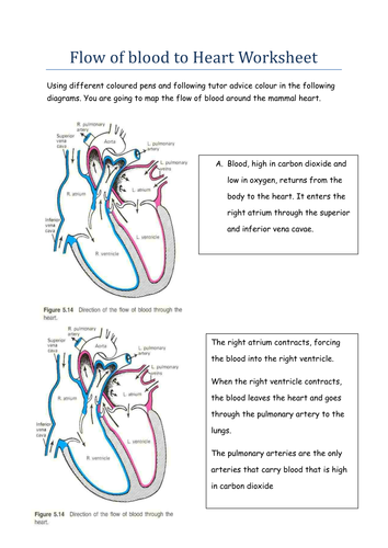 PDF Blood Flow Assignment You must demonstrate your knowledge on the flow of blood through the heart by choosing one of the following assignments: 1. Create a story using the flow of blood as your timeline. For example, the story begins in a fictional location called the vena cava…. Have an event take place in each location of the heart that leads to the next location. 2. Heart Anatomy And Blood Flow Teaching Resources | TpT Results 1 - 24 of 213 — This worksheet teaches the student the parts of the heart and blood flow through labeling. Also, the student colors the oxygenated and ... Heart Worksheet - WikiEducator Heart Worksheet. 1. The diagram below shows an external view of the mammalian heart. Show the positions of the following structures on the diagram. pulmonary artery, coronary artery, cranial vena cava. 2. The diagram below shows a section through the heart seen from the same direction as the external view in question 1.
